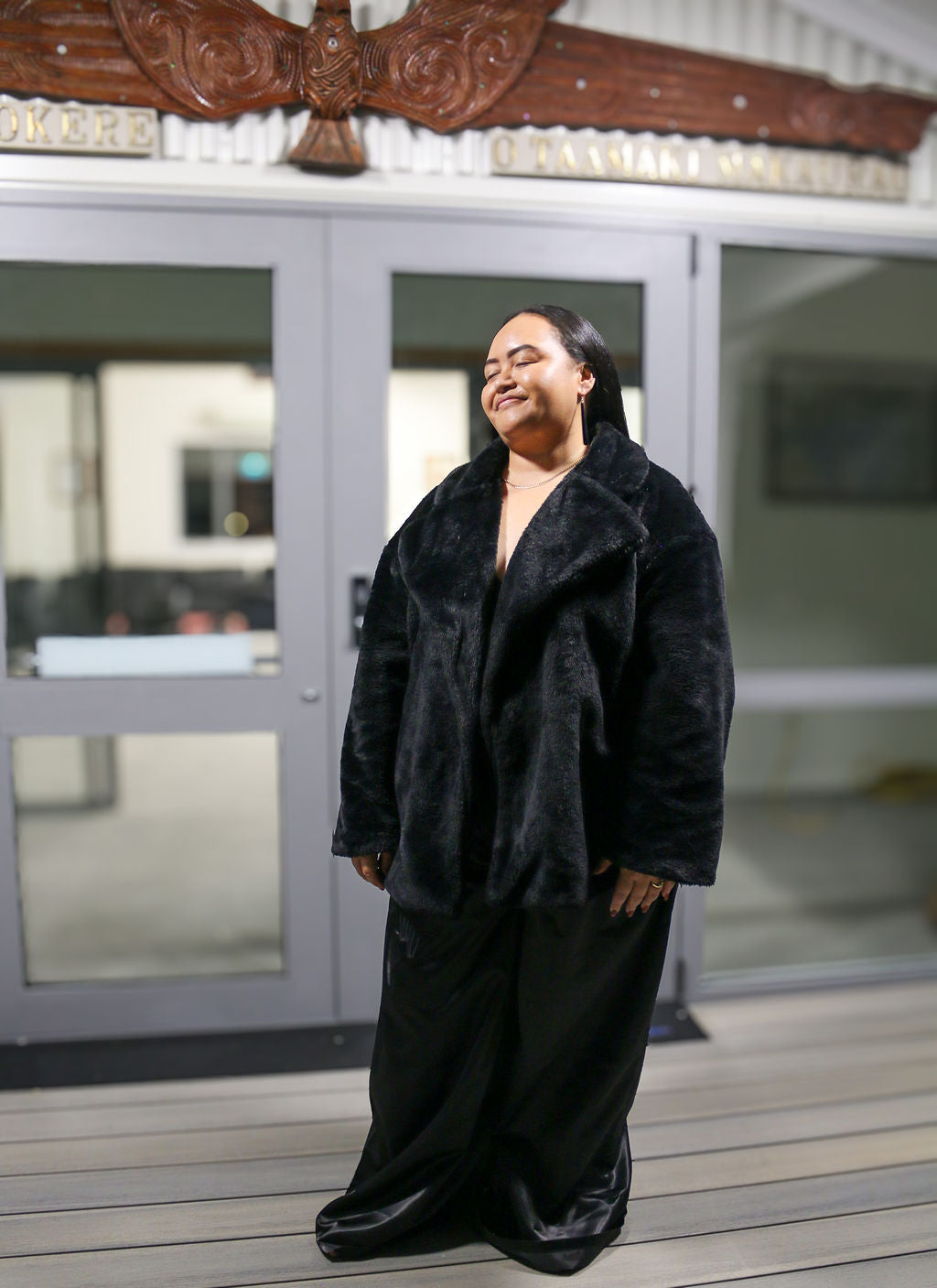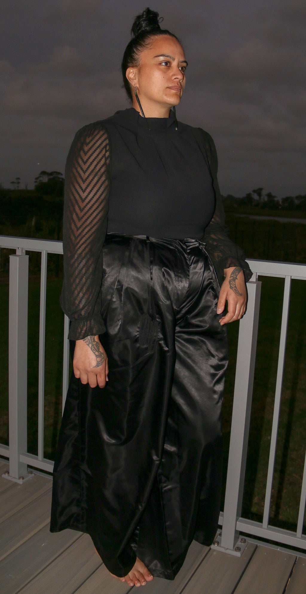 The Black x Black Pants have pockets on each side, and a minimal embroidered Mataatua design on the right thigh.